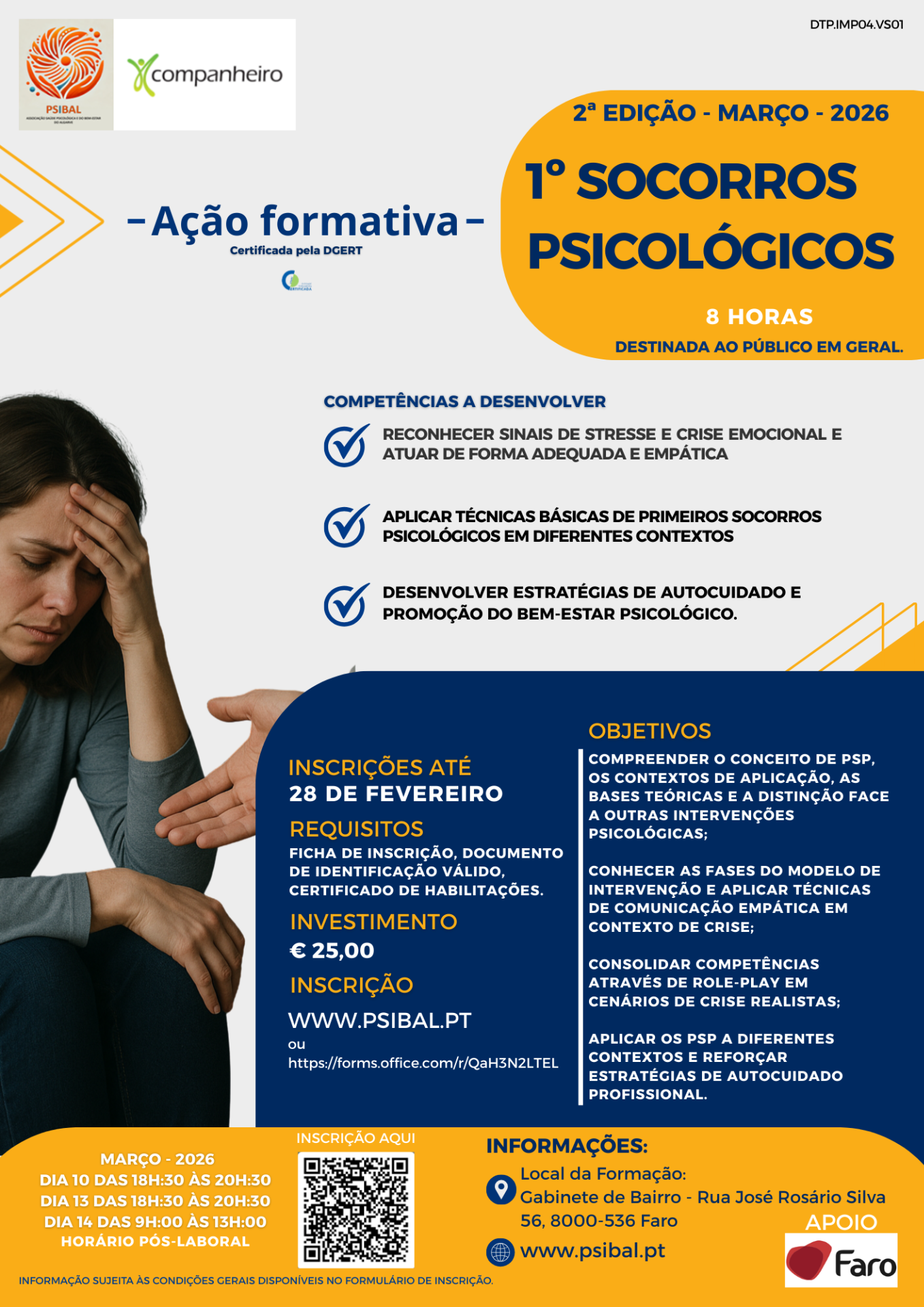 A PSIBAL – Associação Saúde Psicológica e do Bem-estar do Algarve, em parceria com O Companheiro, convida-te a participar na ação formativa "1.º Socorros Psicológicos", certificada pela DGERT e destinada ao público em geral.